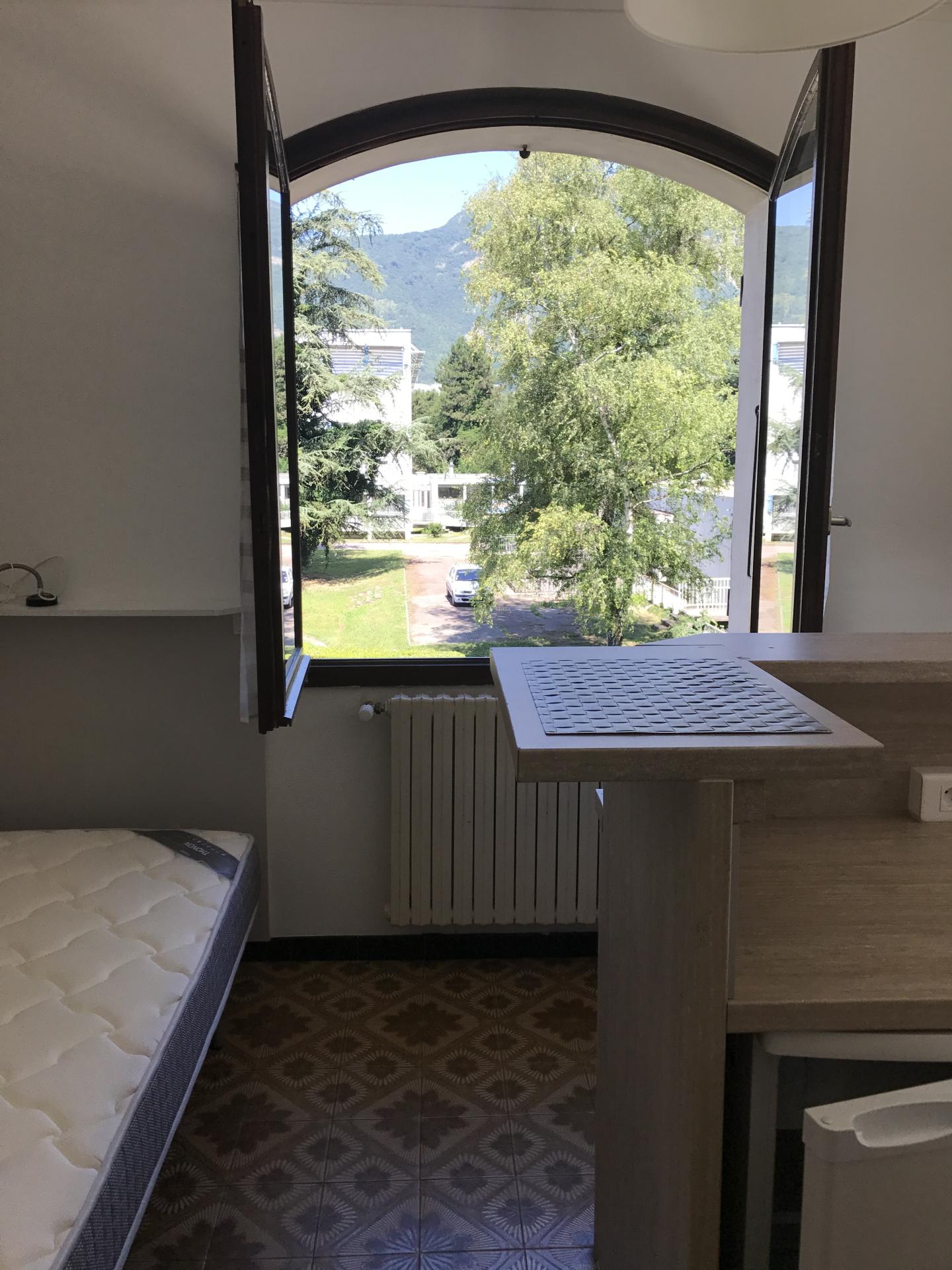 Descriptif : Studio de 16,76 m² exposition nord-ouest pour la fenêtre et nord-est pour la porte-fenêtre, meublé, entièrement équipé (rideaux/voilages, vaisselle, luminaires, accessoires, poubelles...). Disposant d'un espace terrasse privatif en accès direct devant sa porte-fenêtre.